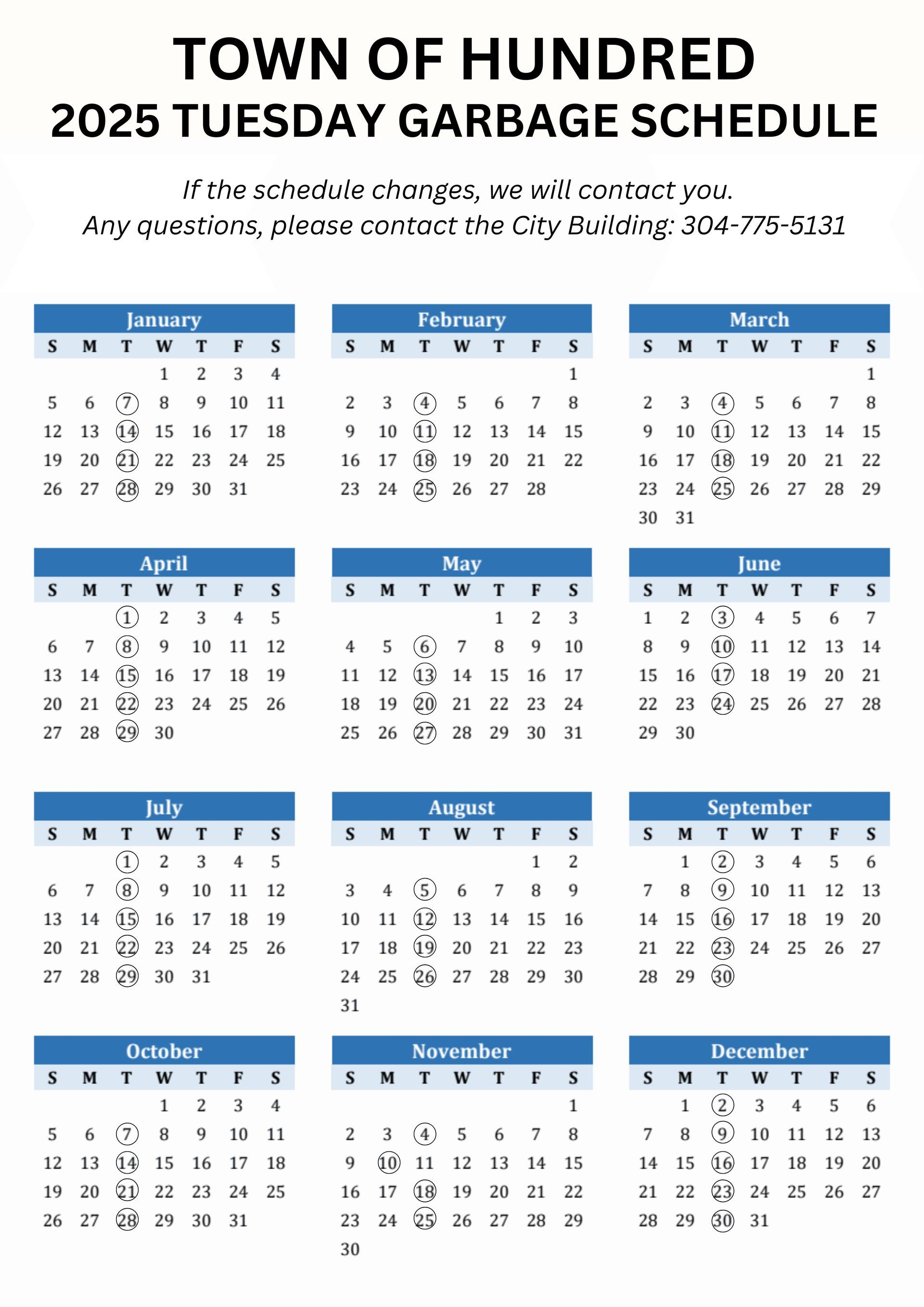 Trash will be picked up EVERY Tuesday, with the following EXCEPTIONS: